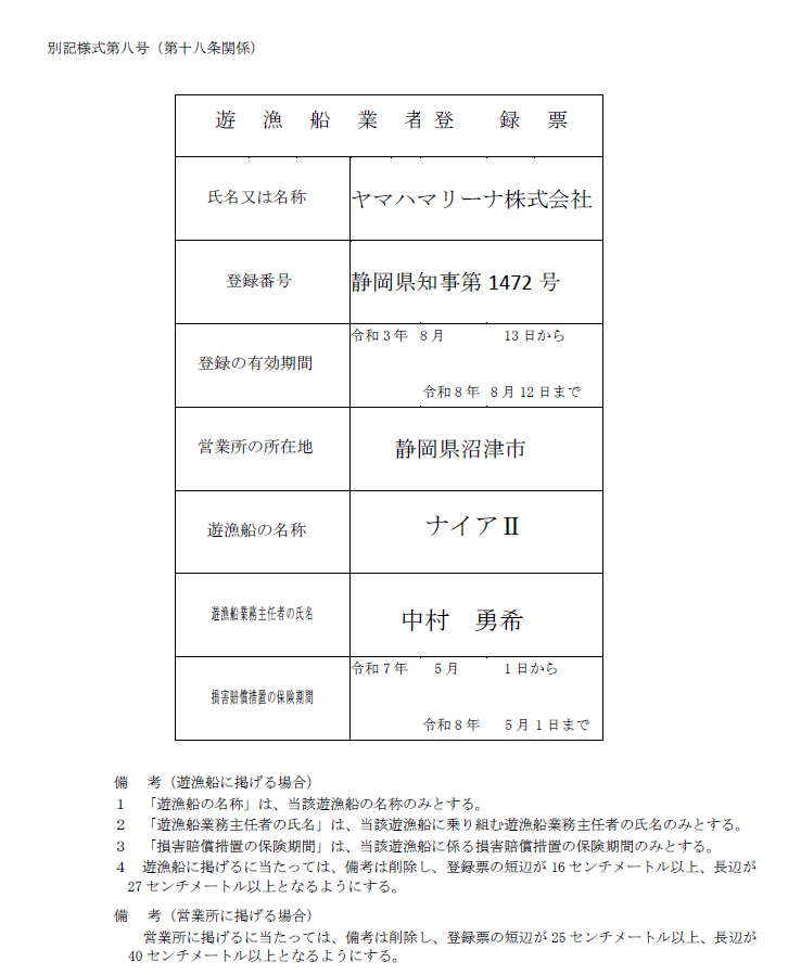 この度、当マリーナにて実施しておりますシースタイルフィッシングチャーターに関連し、遊漁船業者登録票をホームページ上でも掲示させていただくこととなりましたのでご案内申し上げます。