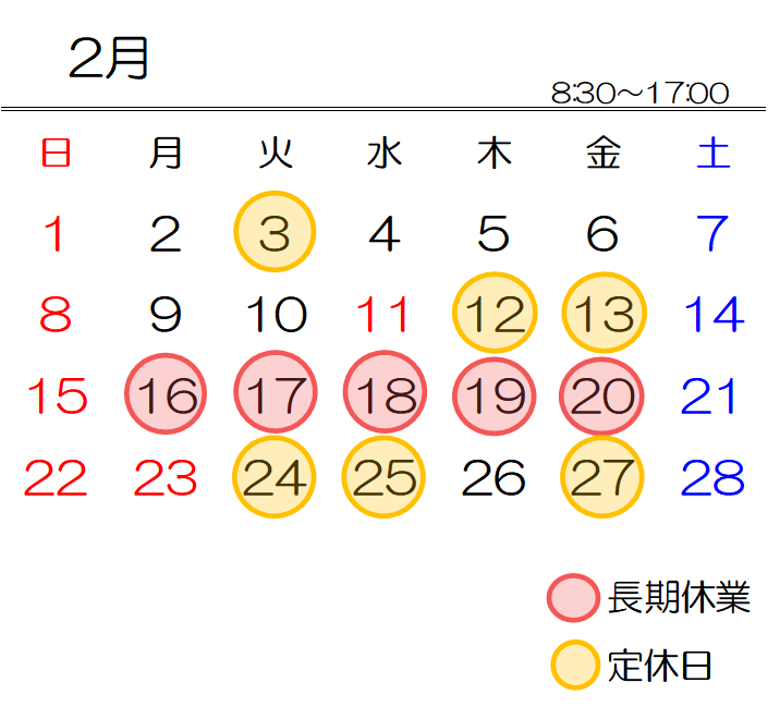 なお、上記長期休業期間に加え2月休業日は変則的となっております。詳細につきましては、カレンダー記載の定休日をご確認下さい。