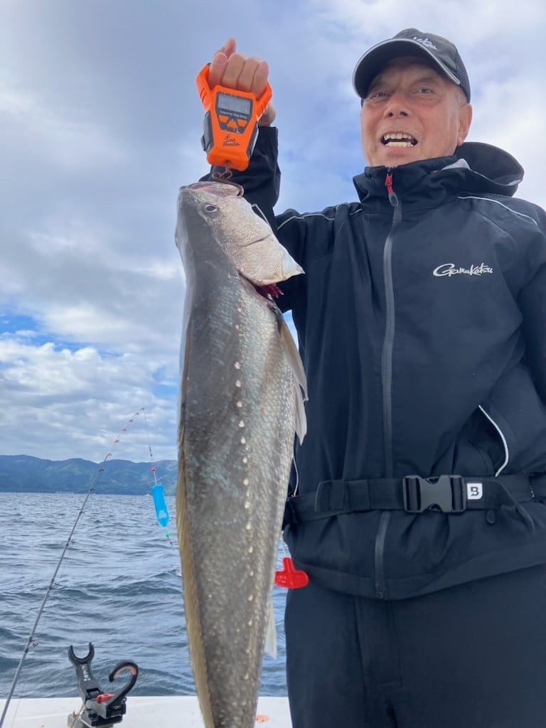 オオニベは水深80m台で、胴付きアジ仕掛けに掛かったアジをそのまま泳がせてヒットしたとのこと。