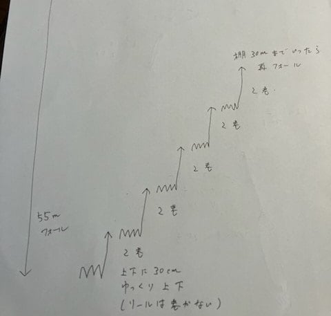 水深55mまでフォールさせてから、30cm刻みで誘いを入れ、2巻きずつ巻き上げて30mまで探るのがコツとのことです。